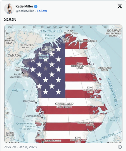 arrow-up1453arrow-down1external-linkU.S. will ‘soon’ annex Greenland, wife of top Trump aide impliesplus-squarewww.arctictoday.comClassy Hatter@sopuli.xyz to World News@lemmy.worldEnglish · edit-214 hours agomessage-square161fedilink