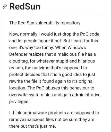 not_IO@lemmy.blahaj.zone to Programmer Humor@programming.devEnglish · 8 hours agoanother windows zeroday, the repo text is hilariousplus-squarelemmy.blahaj.zoneimagemessage-square27fedilinkarrow-up1455arrow-down14