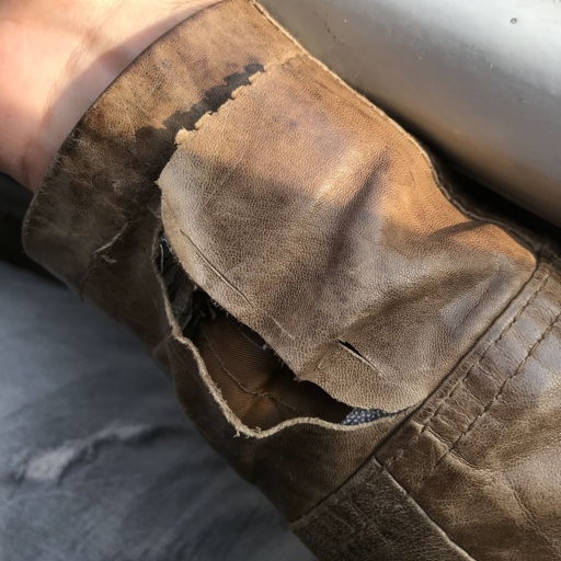 If you can’t find something that even closely resembles the leather on your jacket, take any piece of leather that’s light colored, but darker than the color of the jacket, make some zig-zag stiches on the edges of the piece (kind of like a decoration, use a thead that is almost the same color as the piece or the jacket, not something in between) and just glue that over the torn part from the front side. Use rubber based adhesives, they work best with leather. Then, do the other sleeve as well (for symetry). Stitch over the patch in any way you like, to add a bit of robustness to the patch.