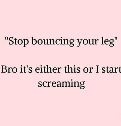 Me: Causally sitting, leg bouncing is almost a blur My Mother: stop shaking your leg My GF: stop shaking your leg My Teachers(all of them): Stop shaking your leg Me: starts tapping pens and pencils or drumming fingers on any and all surfaces | Repeat above constant nagging ad nauseam