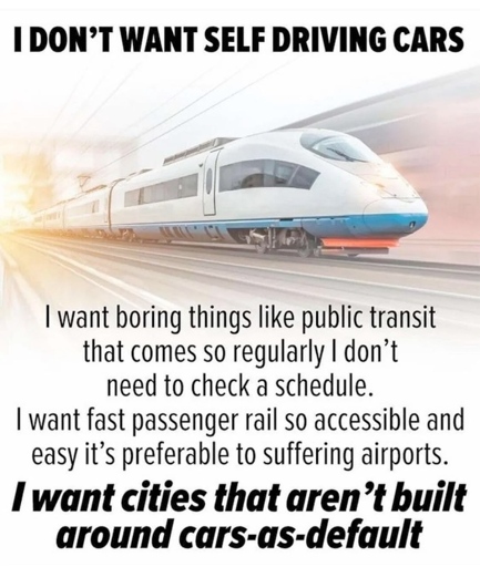 The practical problem with this is that individual transport is (1) horribly space-inefficient, (2) doesn’t scale well at all. Self-driving vehicles improve both slightly, but it still sucks ass compared to a light rail line. It also sucks from the environmental perspective, putting microplastics from rubber everywhere, overproducing hundreds of tons of lithium-ion batteries, etc.