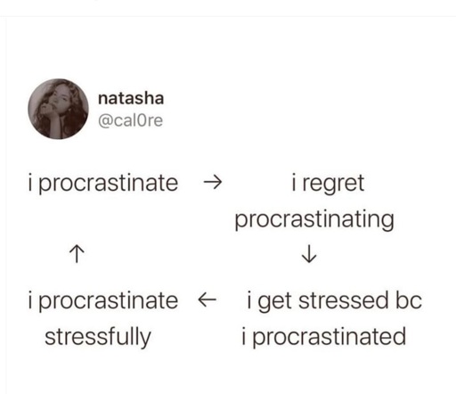 Procrastination is when you fully have the ability to do something and choose not to do it but to do the thing you prefer doing instead. I hadn’t experienced this until very recently, after a lot of therapy and medication.