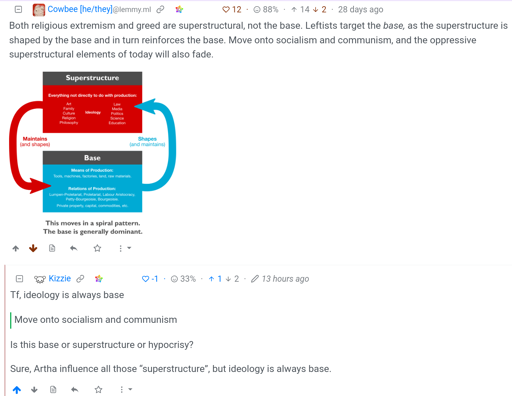 Yesterday I had argument with Cowbee about this here. This seems like hijack of word “base” to support their propaganda like many others Words Which Defy Dictionaries. Base, is always ideology. Sure their so called “base” influence upper ones, but it is not the base. Base is something core, without it the thing cannot function. can human live without ideology? Without right or wrong?
