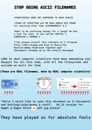 You complain about ASCII filenames but a few of the examples are obviously Unicode, namely using emoji, well outside of the ASCII character set. But since you’ve brought up Unicode file names, let me introduce you to bidirectional text!