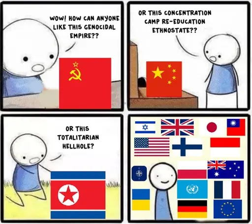 The meme isn’t trying to say “eveyone is bad.” It’s showing the hypocrisy of liberals when they make up and believe false bad things about AES states but simp for their country when their country actually does those same things. For example when westerns cry “China is imperialist” (reading about China’s socio-economic system would show that’s not true) but ignore/support their country actually exploiting the Global South.