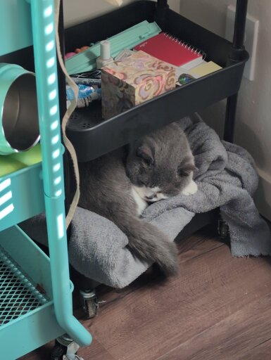 My partner is an artist and has a corner of the apartment for her art stuff. He found this bottom section of her art cart to be comfy. We put a blanket down for him so that he would be more comfy.