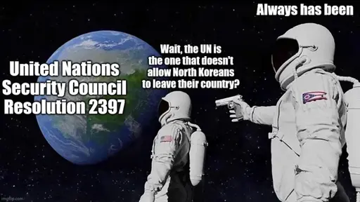 The above meme references a resolution that forbids NK citizens from working outside the country to send remittances back, as a part of a sanctions regime against the country for nuclear proliferation. It doesn’t forbid travel. So, you’re the liar in this case. Idk why, scarcely care.