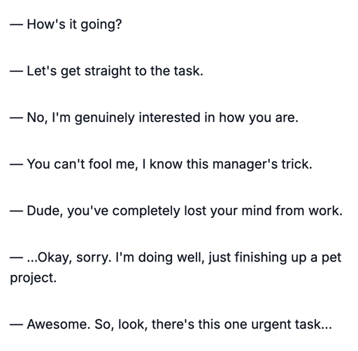 Had a manager who would shoot the bullshit with me for our one-on-one time. I open about my life, he never pushed, but he genuinely wanted to make sure his people were doing OK. Guy that replaced him went straight to business and was hella uncomfortable talking about anything else. Not that his personality sucked, but he believed in working every second of the day. Talk about whiplash.