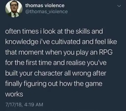 Yep, this is I. I have a terrible min-max disease. Also, sometimes I forget to play a game for a while and then I don’t remember the story line leading up to where I am in the game, and then I have to play from the start again. That’s why it took me like 3 years and many restarts to get through Witcher 3.