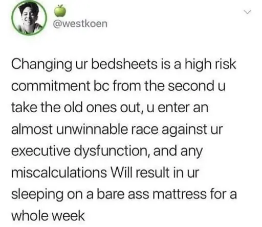 I have never done this, and I’ve been on long term sick leave for 15 years due to my executive disfunction/action paralysis. I have gone months without changing bedclothes but not once taken them off without having clean ones to put on at the same time. I’m pretty sure this is a problem from something else and not what’s stated.