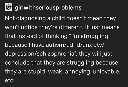 Mom never took me to get tested because she didn’t want me to grow up with “that label” or whatever. Jokes on her cuz I basically had that label for everyone except me and her my entire child and teenage life.