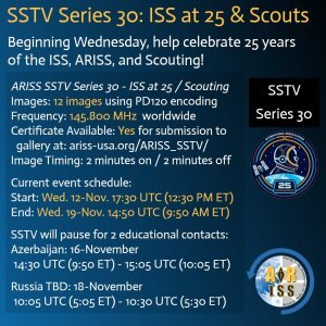 From November 12-19 amateur Slow Scan TV (SSTV) transmissions are expected from the International Space Station (ISS) to commemorate the ISS at 25 and Scouts. Start: Wednesday, November 12 1730 GMT…