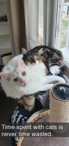 A picture of a white cat and a tabby cat lounging together. The caption says “Time spent with cats is never time wasted.”