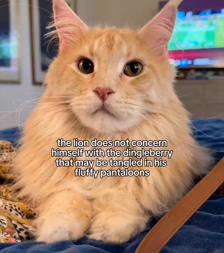 A picture of an orange cat with a caption “the lion does not concern himself with the dingleberry that may be tangled in his fluffy pantaloons.”