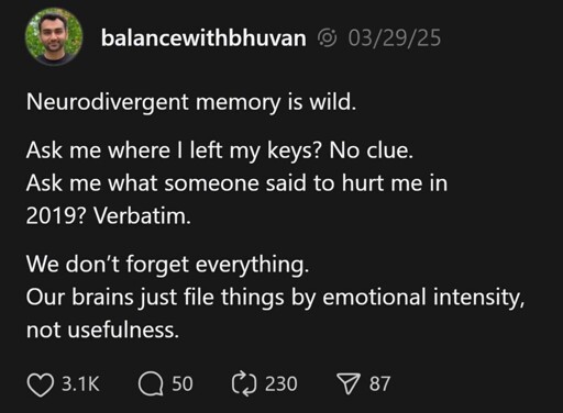Truth is ADHDers just have a shot working memory. AFAIK Everyone remembers high emotional intensity memories, AKA “core memories”. We all remember those fucking cringe moments 5 seconds before sleeping. Its just ADHDers just can’t remember anything else :D