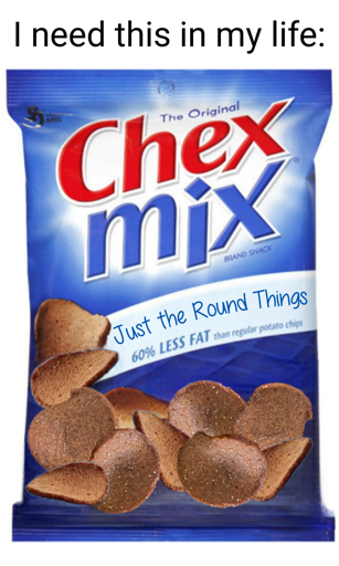 minus-squarei_dont_want_to@lemmy.blahaj.zonelinkfedilinkarrow-up8·12 days agoIt’s based on the snack, Chex Mix. Chex Mix is made of pieces with several different consistencies, like salty Chex, mini pretzels, mini breadsticks (small oblong cracker things), and rye chips (the round things). The rye chip part of Chex Mix is really popular.