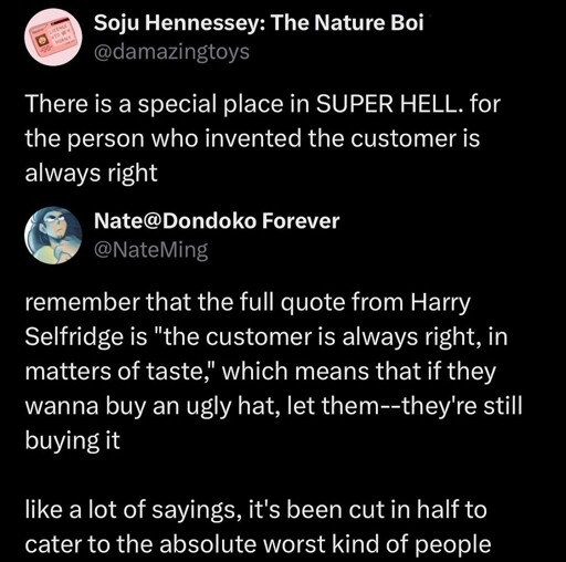 But “the customer is always right” (by itself) was even their ad slogan.