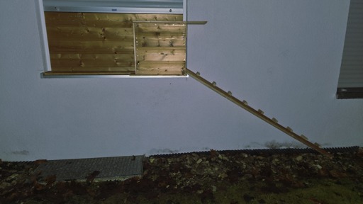Nachdem ich endlich verstanden habe, dass meine Miez nicht auf das etwaig nasse Fensterbrett hüpfen möchte, also habe ich ihr eine Katzentreppe mit Durchgangsschleuse gebaut.