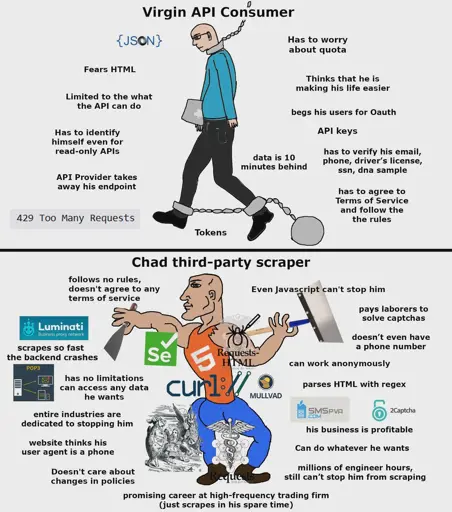 Guess who recently asked a company if he could get access to the API they use to load stuff in their frontend from their backend and got told “Nope and btw scraping is against our TOS”?