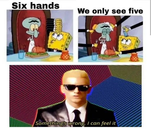 Six right hands and one left. We see four right hands and one left. Two are unaccounted for. Squidward must be packing.