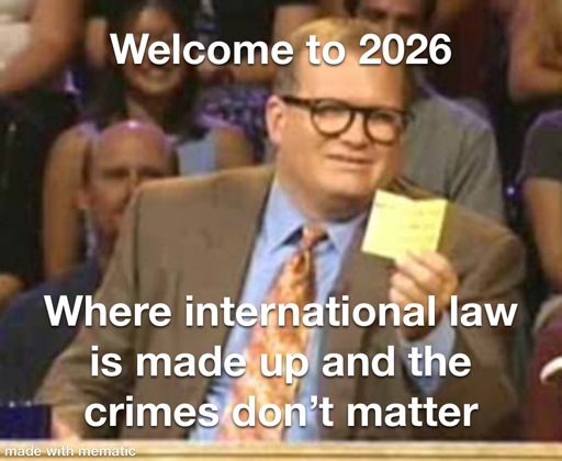 A picture of Drew Carey from the show “Whose Line is it Anyway?” reading a cue card and saying “Welcome to 2026! Where international law is made up and the crimes don’t matter!”