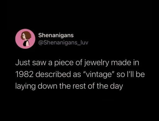 minus-squareShaggyBlarney@lemmy.calinkfedilinkEnglisharrow-up36·2 months agoUhh…hmmm, I wanted to call it out but vintage is considered anything 20-99 years old. So 2006 is coming into vintage…