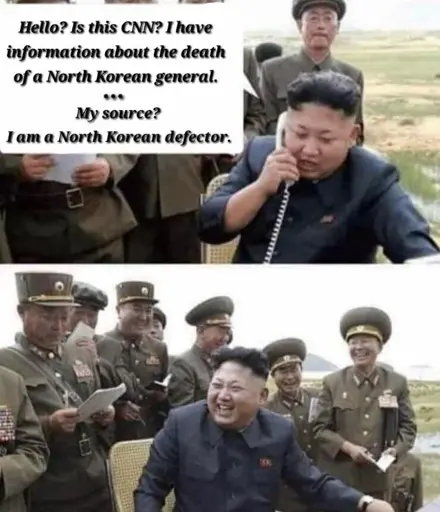 minus-squareNemo's public admirer@lemmy.sdf.orglinkfedilinkarrow-up9·edit-26 days ago Hello? Is this the CNN? I have information that a leftish North Korean general was sent straight to the gulag, for not laughing at the great leader’s supreme joke … My source? I’m a North Korean defector