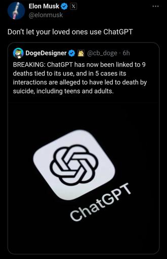 arrow-up194arrow-down1imageElon Musk and Sam Altman clashed on X after Musk shared a post about a man who committed a murder-suicide following delusional conversations with ChatGPTlemmus.orgBeep@lemmus.org to Technology@beehaw.orgEnglish · edit-214 hours agomessage-square17fedilinkfile-text