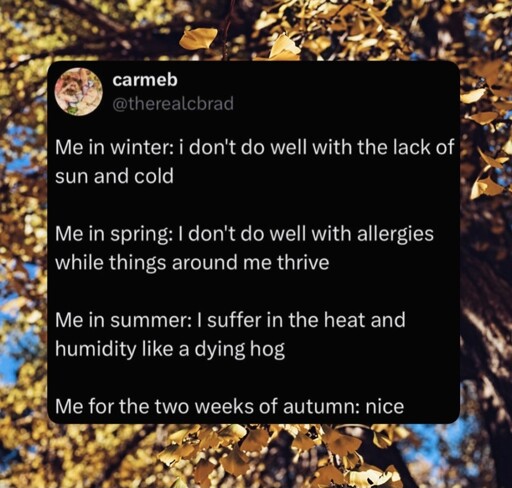 Autumn: The temperature is soo nice! AND OMG LOOK THE FOREST IS SO BEAUTIFUL