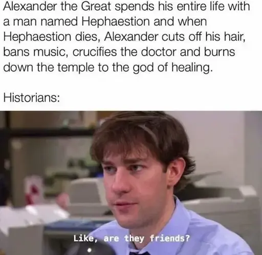 To be frank tho, not everything is gay and I sure as hell would be grief stricken if my best friend died. The difference is I do not wield as much power as Alexander did. xD