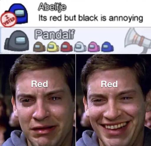 The bottom pictures depict Red crying at being found out, but smiling because the crew chose to vote out someone else instead.So, the characters at the top are from the game Among Us, in which players are crewmen on a spaceship, except one of the players is an impostor trying to sabotage the ship. After every round of play, all the surviving players vote on who they think the impostor is, and the loser of the vote gets spaced. The blue player is saying that he thinks the red player is the impostor, but is voting on spacing the black player despite that.