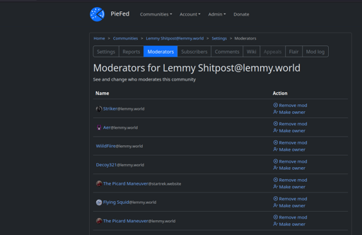 It appears to only apply to my server, but it’s strange I can change stuff in a community that I don’t own. I spun up a PieFed server, federated with lemmy shitpost, and I can supposedly change members and mods.