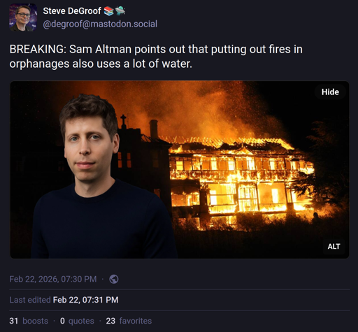 it’s great that one of the main dicks in charge of AI uses pants-on-head stupid not-logic to justify taking water away from literally everything else for a thing that doesn’t work, but still steals jobs