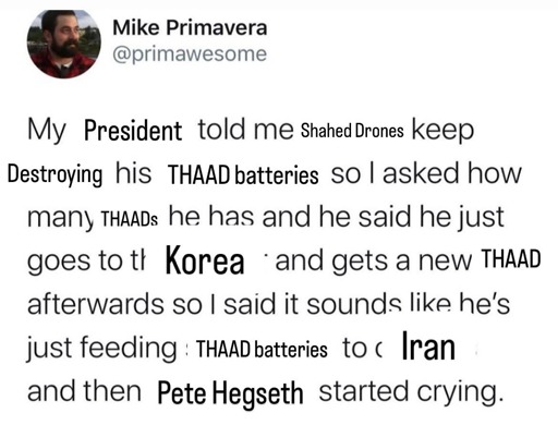 Nah, Iran destroyed many of our THAAD systems in West Asia and rhe US took one we had placed in South Korea to move it to that region.