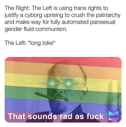 If only the Left and the Right could work together to prevent the cyborg uprising of the capitalists that makes way for fully automated pansexual gender fluid capitalism.