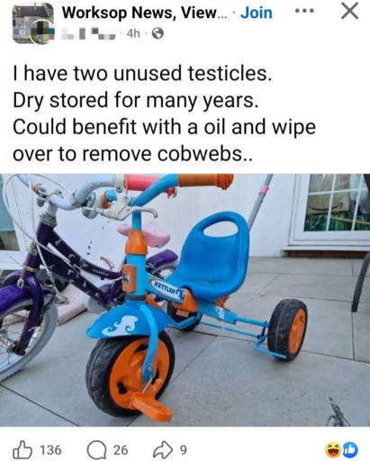 minus-squareShinkanTrain@lemmy.mllinkfedilinkEnglisharrow-up13·18 hours agoFor sale Two testicles Long unused