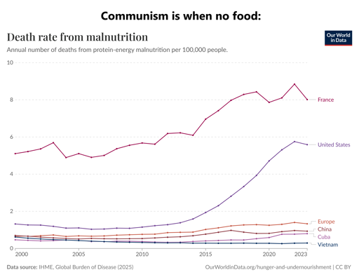 I am french. I already saw these figures and tried to understand why it was like that. The figures might be technically correct but it doesn’t make sense to compare them with other countries. 5000 people dying each year of hunger, it would be revolting.