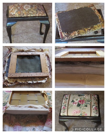 This project is more stapling than sewing, but small upholstery projects are quite easy to do, and can be done with small amounts of fabric and padding. The padding for this project was mostly layers cut from an old quilt.