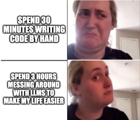 Let ChatGPT generate fucky code and let $me fix it over the span of 7 weeks: Hell yeahHad I realized that it all was generated, and he didn’t have a single little clue how it works, I would’ve just rewritten it with django or something. Hell, technically the whole server part wasn’t needed, it could’ve been index.html, style.css and scripts.js and that’s it.