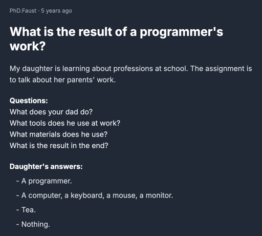 arrow-up1901arrow-down1imageWhat is the result of a programmer's work?lemmy.mlcm0002@sh.itjust.works to Programmer Humor@programming.dev · 4 days agomessage-square107fedilink